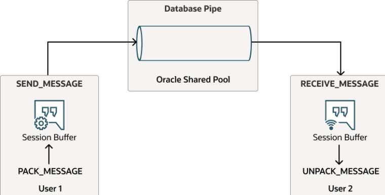DBMS_PIPE Connecting the Sessions Mustafa Kalaycı, 2023-08-182025-12-08 Hi, It has been a long time since I wrote something. It is summer and I was in a long vacation. Well I worked mostly of course but at least get away a little bit. In this post I would like to talk about PIPEs in Oracle Database. It is a way to communicate between sessions. As you know, in Oracle Database, you cannot read another sessions variable values. Let’s say a session made some calculations and generate a result. to inform other sessions about this data vast majority of the systems are using database tables of course and it is the correct way to do it because all data will be safe via redo logs. What if we need more speed and loosing that data is not important? That is where PIPEs are involved. PIPEs allow sessions communicate each other without any transactional operation. which means no insert, no select, no redo and as a result more speed. PIPEs are simply a memory area (a variable you may say) that you put some data into and some other session can read that data and do some stuff. They work as FIFO (First In First Out), you put some messages into the queue and some other session or even the same session can get those messages in order. How does it work: you prepare a message (message may contain one or more different or same data types). during the preparation, your data will be written into a small buffer in your session. When you send the message, data you prepared will be copied into the pipe memory area. your session buffer will be purged. some other session (or the same session) will receive the message from pipe memory area into its own session buffer, message will be purged from the pipe, then unpack the message and get data into variables and do some stuff. Basic components of Pipes Message: Message is a collection of message items. by saying collection, don’t confuse with plsql collections. your messages can contain different type and number of data, for example, your message contains a user information like name, last name, login date, user id etc. you can set as many different “message item” in your messages. you can think them as a “PLSQL Record”. Message Item: Every single entity in your messages. you can put message items in your messages as many as you want or as many as your session buffer/pipe size can hold. when you receive a message, it may contain more then one item in it. For example, received message might contain, Stock Name and Time, so you can send back the price of that stock at that time. Session Buffer: every message item is written into a buffer in your session. When you send the message, all items in the buffer will be pushed into PIPE and the session buffer will be purged. if you don’t send the message, then message items will be stay there as long as the session exists or you send another message. this session buffer size is strict and it is 4096 bytes (when I checked the size in an autonomous database, I saw that it is set to 32767, so autonomous db is always better 🙂 ). PIPE Size: this is the size of the memory area of the pipe. if you keep sending messages to pipe but not receive them eventually memory area fill be full and your “send message” function will hang until some space is available. you can set the size of the pipe while creating it. default is 8192 byte (and again in the cloud autonomous database default is 65536 bytes). let’s create a pipe: Oracle PL/SQL declare v_status number; begin v_status := dbms_pipe.create_pipe('MY_PIPE', maxpipesize=>32768); if v_status != 0 then raise_application_error(-20000, 'PIPE create error'); end if; end; / 123456789 declare v_status number;begin v_status := dbms_pipe.create_pipe('MY_PIPE', maxpipesize=>32768); if v_status != 0 then raise_application_error(-20000, 'PIPE create error'); end if;end;/ create_pipe is a function and if return value is 0 then it is all set, our pipe is ready. This is explicit pipe creation. we can set PIPE size via MaxPipeSize parameter, the memory area in the SGA which will store the sent messages. send a message: Oracle PL/SQL declare v_status NUMBER; BEGIN DBMS_PIPE.PACK_MESSAGE('hello pipe'); --1 v_status := DBMS_PIPE.SEND_MESSAGE('MY_PIPE', timeout=>10, maxpipesize=>32767); --2 IF v_status != 0 THEN --3 raise_application_error(-20099, 'Message Send Error'); END IF; END ; / 123456789101112 declare v_status NUMBER;BEGIN DBMS_PIPE.PACK_MESSAGE('hello pipe'); --1 v_status := DBMS_PIPE.SEND_MESSAGE('MY_PIPE', timeout=>10, maxpipesize=>32767); --2 IF v_status != 0 THEN --3 raise_application_error(-20099, 'Message Send Error'); END IF;END ;/ there are 3 important parts in this message as I added comments. first one is PACK_MESSAGE. this is the “message item” that I mentioned above. every message can contain one or more different data in it. Oracle PIPEs allow 5 different data type in your messages. VARCHAR2, NUMBER, DATE, RAW and ROWID. PACK_MESSAGE procedure is an overloaded procedure and can handle the data types you send. in the example above, we add “hello pipe” varchar2 data into our message. every time you call PACK_MESSAGE, the data will be put into “session buffer” (which is limited to 4096 on prem and 32767 on autonomous database). so, if you try to add data bigger than the session buffer size, you will get “ORA-06558: buffer in dbms_pipe package is full. No more items allowed” error. at that point either you must RESET the buffer via dbms_pipe.reset_buffer function or send the message (even if it is not complete from your perspective). sending message will clear the buffer as well. second part is sending message, SEND_MESSAGE function. only PIPE name is enough to send a message. this function returns the status of sending message. 0: message is sent. 1: timeout. PIPE might be full. in that case your send message will wait for a time, default is 1000 days which is a little bit long. I set it to 10 seconds in my example above and if in 10 seconds message ca